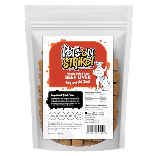 PETS ON STRIKE Freeze Dried Beef Liver for Dogs & Cats is the ultimate single-ingredient treat that your pets will love. Made from 100% real beef liver sourced and made in the USA, these protein-packed treats are designed for pet owners who prioritize quality nutrition. With no grains, fillers, or artificial additives, you can trust that your furry friend is getting only the best. The freeze-drying process preserves essential nutrients, making these treats not only tasty but also beneficial for your pet™s health. Ideal for training, rewarding, or simply treating your companion, these beef liver goodies will keep those tails wagging!
